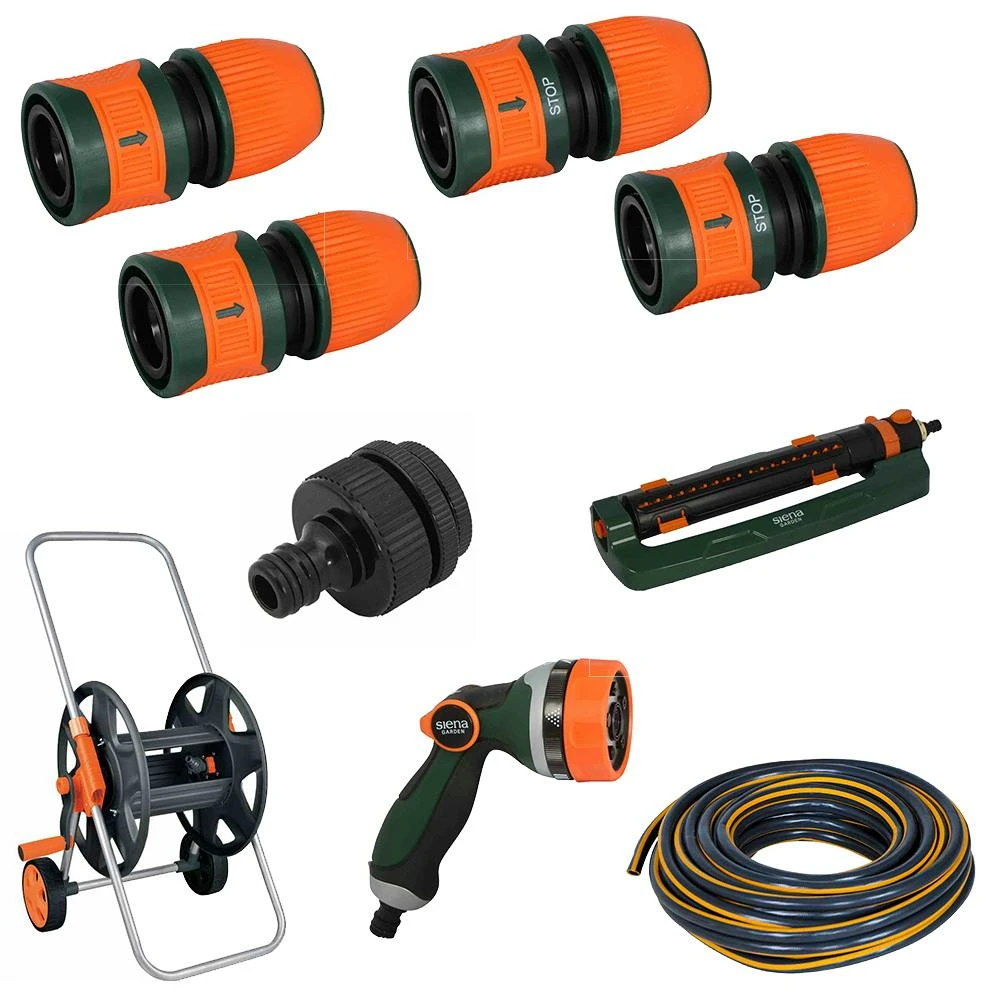 1x Viereckregner 3000 Sprengbreite bis 15m Reichweite von 6m bis 20m einstellbar beregnete Fläche: max 300m² Wasserdurchflussmenge per Dosierrad regulierbar Basis aus Metall Düsenrohr aus Aluminium inklusive Nadel zum Reinigen der Düsen am Ende des Düsenrohrs 1x Comfort Multibrause 7-fach verstellbar: Brausestrahl, Flachstrahl, Perlstrahl, Sprühnebel und drei weitere Vollstrahlmuster Wasserdurchfluss stufenlos regulierbar ergonomisch geformter Griff und Impulsauslöser gummierter Ring am Brausekopf zum Schutz und zur angenehmen Verstellbarkeit 1x Gartenschlauch Premium Länge: 30 m, 13mm (1/2″) 5 Lagen, mit spiralförmigem Tricotgewebe besonders knick- und verdrehsicher UV-Licht- & Frostbeständigkeit algenresistent Blei-, barium-, cadmiumfrei, ohne Phthalate 1x Schlauchwagen Metall das Gestell und die Trommel sind aus pulverbeschichtetem Stahl gefertigt der Schlauchwagen sorgt für einen bequemen Transport und eine schonende Aufbewahrung des Gartenschlauchs die leichtgängige Handkurbel ermöglicht ein komfortables Aufrollen des Schlauchs der angewinkelte Schlauchanschluss im Inneren der Trommel verhindert ein Abknicken des Schlauchs, für maximalen Wasserdurchfluss der Griff lässt sich einfahren, für eine platzsparende Lagerung 1x Hahnstück Adapterset 2x Schlauchstück 13mm (1/2″) 2x Wasserstopp 13mm (1/2″)