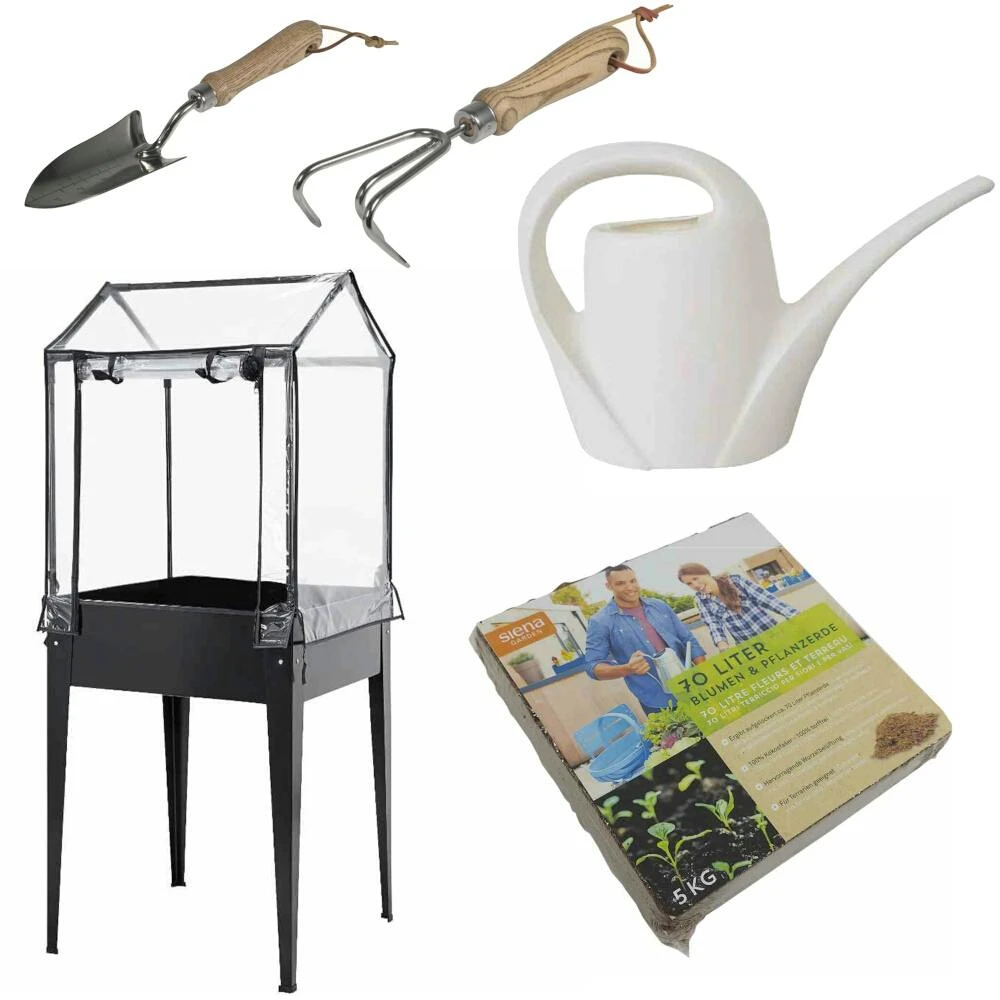 Hochbeet mit Gewächshaus schlichtes Metallhochbeet, pulverbeschichtet inkl. Gewächshaus ideal für den Einsatz auf Balkon und kleinen Terrassen Maße: 60x60x130 cm Wasserablaufloch im Boden Kokosquellerde Nach Zugabe von ca. 25 – 30 Litern Wasser ergibt der 5 kg schwere Kokosquellblock ca. 70 Liter feines aufgelockertes Pflanzsubstrat 100% TORFFREI UNGEDÜNGT Kokoserde ist ein Naturprodukt, 100% rein organisch und ein nachwachsender Rohstoff im Gegensatz zu Torf Frei von Unkrautsamen, Düngemitteln und Schädlingen Gute Wasserspeicherfähigkeit, bedeutet weniger Gießen und eine gleichmäßige Wasserversorgung der Wurzeln Stellt die Sauerstoffversorgung an den Wurzeln sicher, verbessert die Nährstoffaufnahme und sorgt für eine kräftige Wurzelbildung Vollbiologisch abbaubar und zersetzt sich vollständig im Erdreich nach ca. 5 Jahren Universell einsetzbar und gut geeignet als Anzucht- & Aussaaterde für Kräuter, Gemüse und Zierpflanzen sowie Exoten Optimal geeignet zur Herstellung eigener Blumenerde-Mischungen oder zum praktischen Auffüllen von Hochbeet Gießkanne Material: Kunststoff mit langer Gießtülle Fassungsvermögen: 3,0 l Kleingrubber Griffe aus Hartholz Metallteile aus Edelstahl formschöne und stabile Arbeitsflächen lockert den Boden auch zwischen dichten Pflanzungen Pflanzkelle mit Skalierung Griffe aus Hartholz Metallteile aus poliertem Edelstahl formschöne und stabile Arbeitsflächen das universelle Pflanzgerät für Ihren Garten