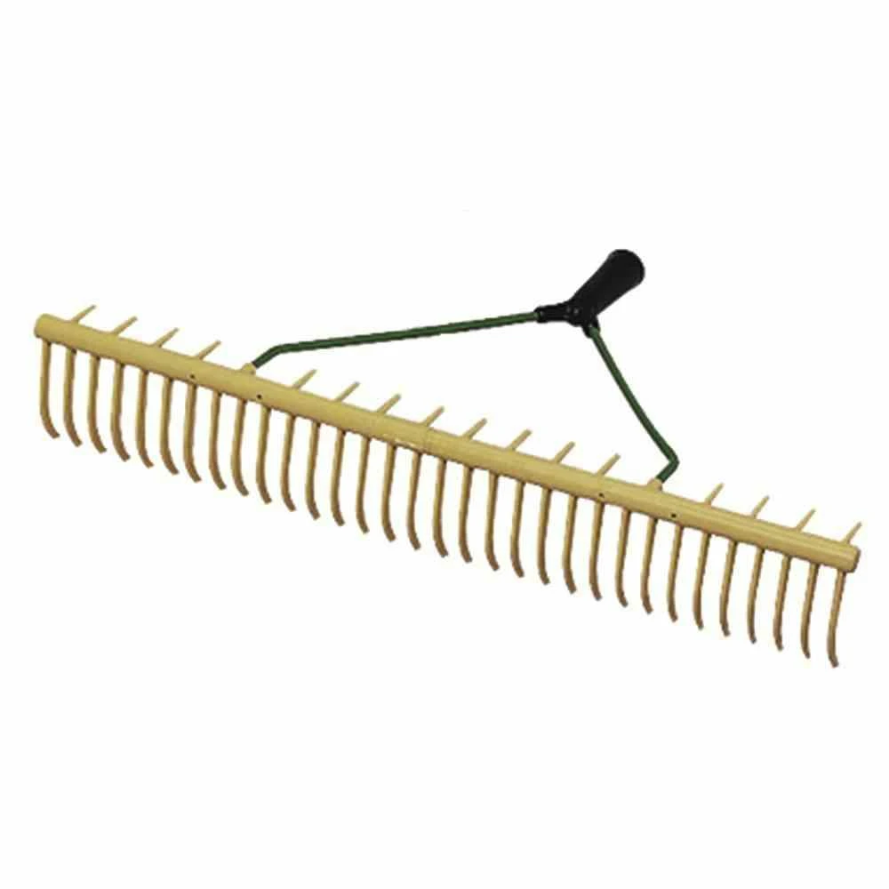 Rechen, Rasenrechen, aus Kunststoff pulverbeschichtet in gelb, Arbeitsbreite: 64 cm, ohne Stiel, Stielaufnahme: Dülle, 32 Zinken, gebogene Zinken