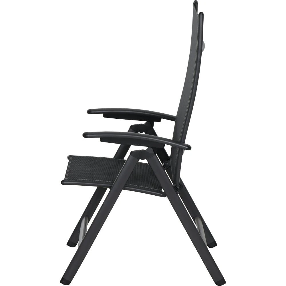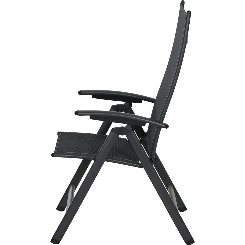 Gestell und Armlehnen aus Aluminium pulverbeschichtet in matt anthrazit Flächen aus Ranotex ® -Gewebe 2*1 in schwarz silber Rückenlehne 10-fach verstellbar Klappsessel: L: 69 cm x B: 56 cm x H: 113 cm