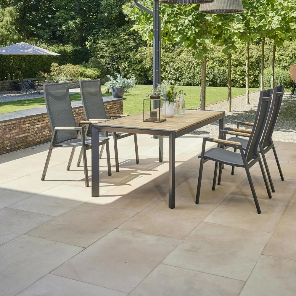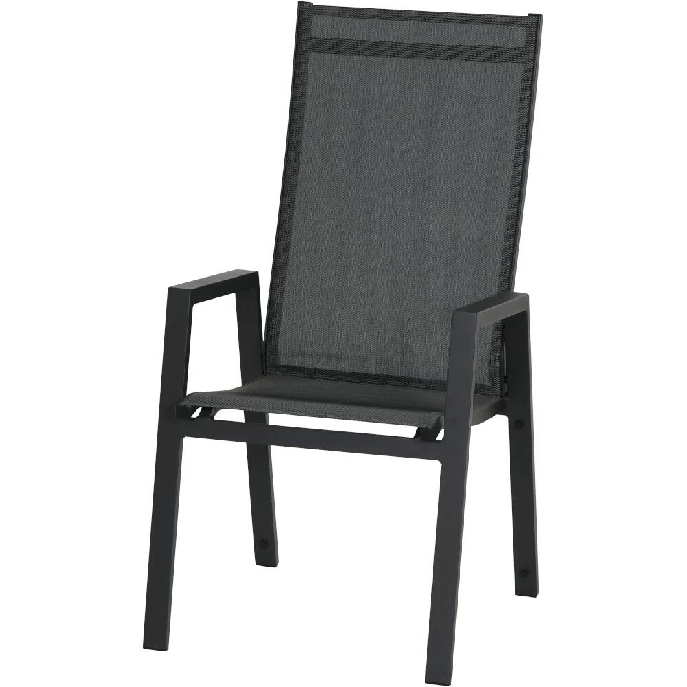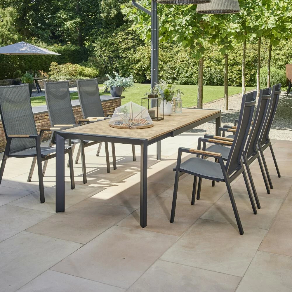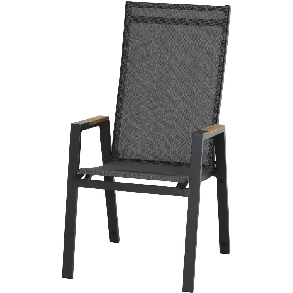 Gestell und Armlehnen aus Aluminium pulverbeschichtet in matt anthrazit Flächen aus Ranotex ® -Gewebe 2*1 in schwarz silber Armlehneninlay aus Teakholz FSC ® 100%
