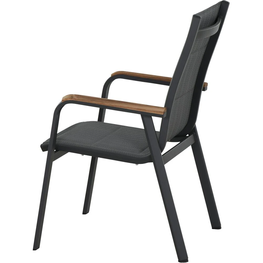 Gestell und Armlehnen aus Aluminium pulverbeschichtet in matt anthrazit Flächen aus Ranotex ® -Gewebe 4*4 in royal grau Armlehnenonlay aus Teakholz FSC ® 100% in natur Stapelsessel: L: 68 cm x B: 62,5 cm x H: 98 cm