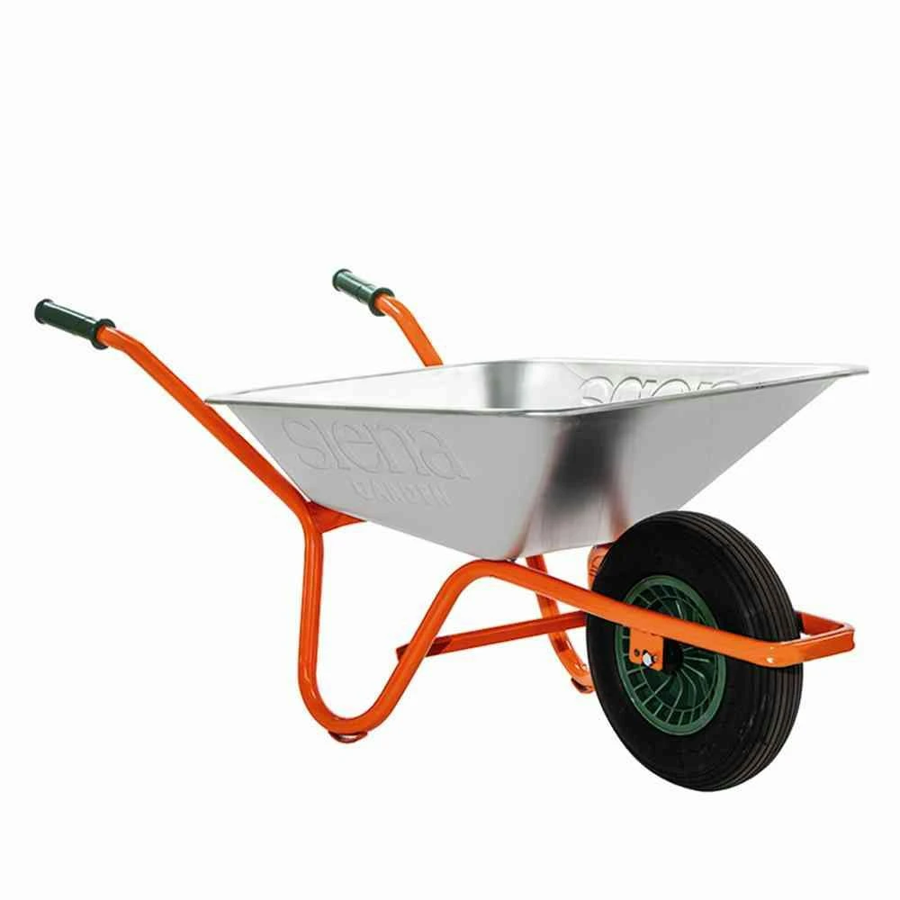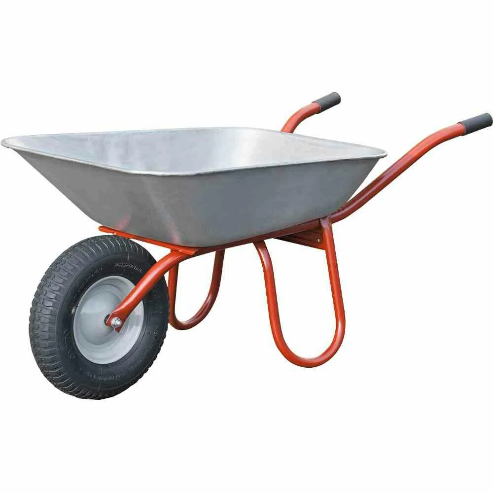 Universalschubkarre 85l flache, verzinkte Mulde lackierter Stahlrohrrahmen, verstärkt mit Kippbügel Luftrad 400×100 mit grüner Kunststofffelge mit Verschleißschutzkufen und Querverstrebung