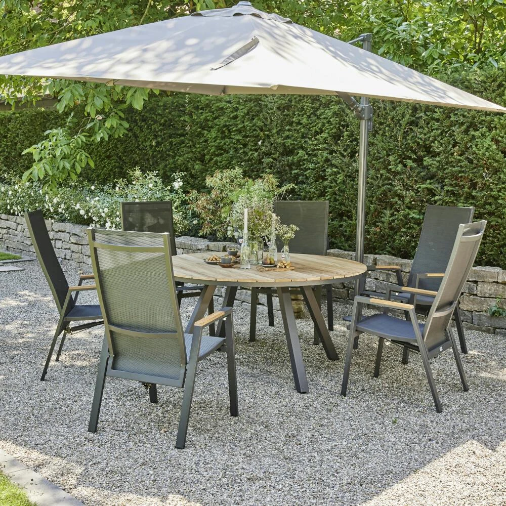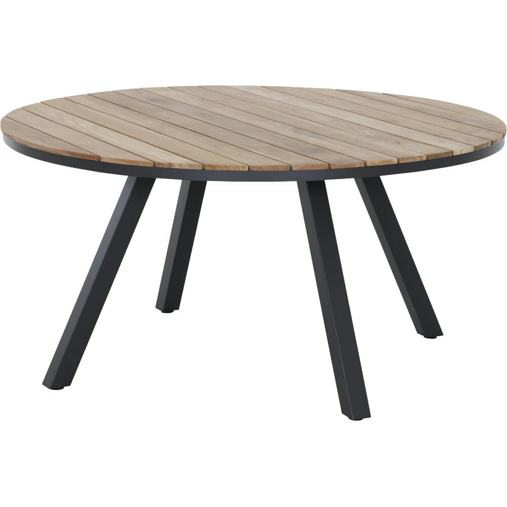 Dining Tisch Zurigo, Ø 150 cm, Gestell aus Aluminium pulverbeschichtet in matt anthrazit, Tischplatte aus Teakholz FSC® 100% in natur
